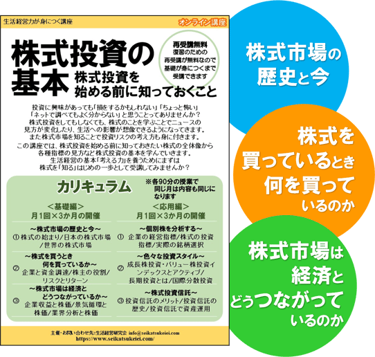 『株式投資の基本』オンライン講座は、基礎編の全3回と応用編の全6回で株式投資の基本を学んでいきます。
