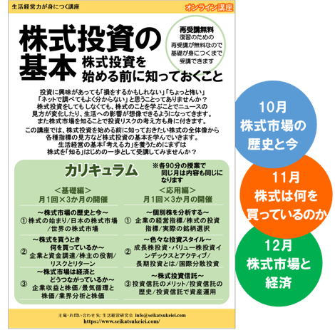 ☆10月16日(水)よりスタート(10月、11月、12月の全3回コース) 『株式投資の基本<基礎編>』 https://www.seikatsukeiei.com/master/onlineseminar/kabushiki-kihon/ 10月から『株式投資の基本<基礎編>』がスタートします。 この講座は、株式投資を始める前に知っておきたい株式の全体像から各種指標のみかたなど株式投資の基本を学んでいきます。 【カリキュラム】...